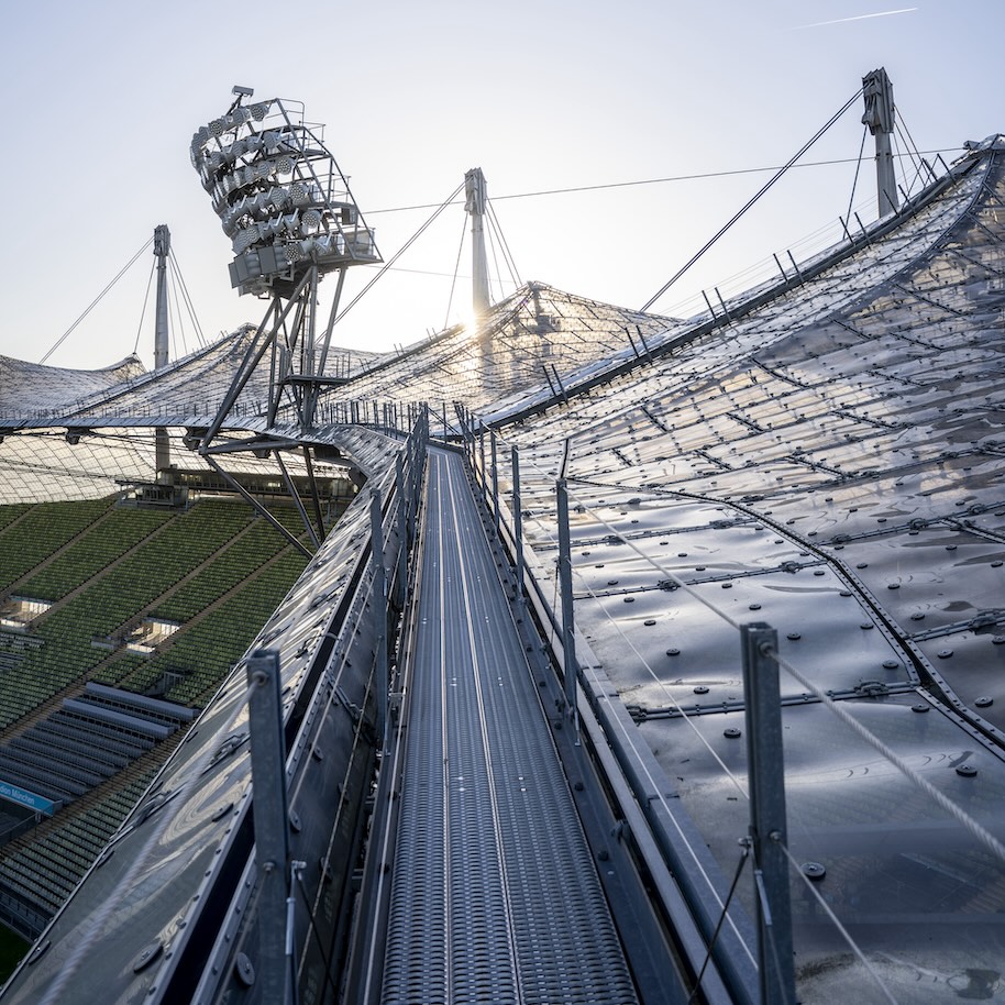 In einer Höhe von 40 bis 50 Metern führen im Rahmen von Touren begehbare Stege über das Dachtragwerk – mit Blick über München und bei klarem Wetter bis zu den Alpen. Dass alle Verbindungen zum Schutz der Besucherinnen und Besucher absolut sicher halten müssen, versteht sich von selbst. Dabei herrschte anfänglich große Skepsis, als das Architekturbüro Behnisch & Partner 1967 seinen Entwurf für das Olympiastadion München und den Olympiapark zum Wettbewerb einreichte. Zu Unrecht, wie die Erfahrungen aus einem halben Jahrhundert bewiesen haben.