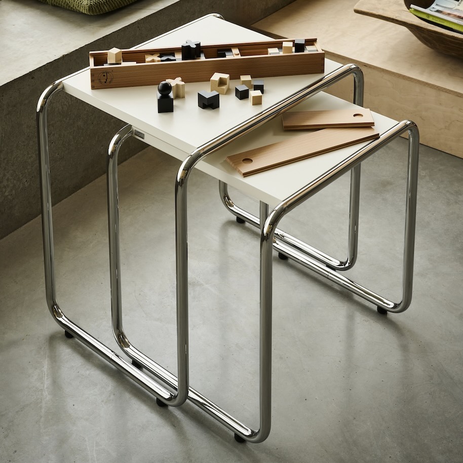 Anlass für das limitierte Ensemble ist das 100-jährige Jubiläum des Bauhauses Dessau und des berühmten Möbelentwurfs B 9 von Bauhaus-Schüler Marcel Breuer. Ursprünglich ein Stahlrohrhocker, gibt das zeitlos elegante Möbel einen perfekten Beistelltisch ab – Thonets Satztischset mit den Größen B 9 a und b beweist es. Als Teil des Jubiläumssets wird es zur stilvollen, platzsparenden Ablagefläche für spannende Stunden mit dem königlichen Spiel.